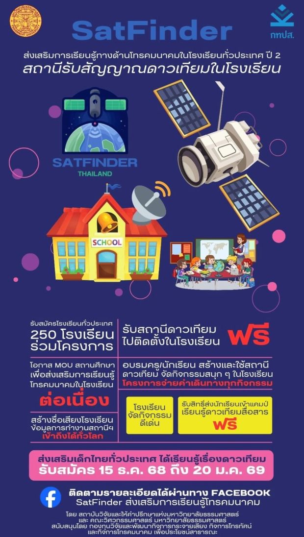 โครงการ SatFinder มุ่งเน้นการส่งเสริมการเรียนรู้ทางด้านโทรคมนาคมให้กับเยาวชนในโรงเรียนทั่วประเทศ ทุกโรงเรียนจะได้รับสถานีรับสัญญาณดาวเทียมในโรงเรียน เพื่อสร้างความเข้าใจในเทคโนโลยีการสื่อสารที่ทันสมัยและต่อยอดสู่นวัตกรรมในอนาคต